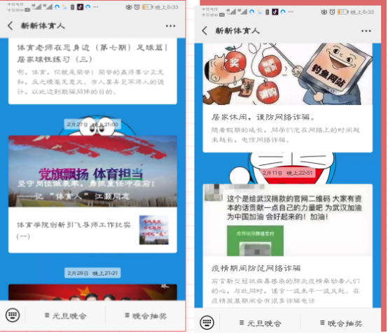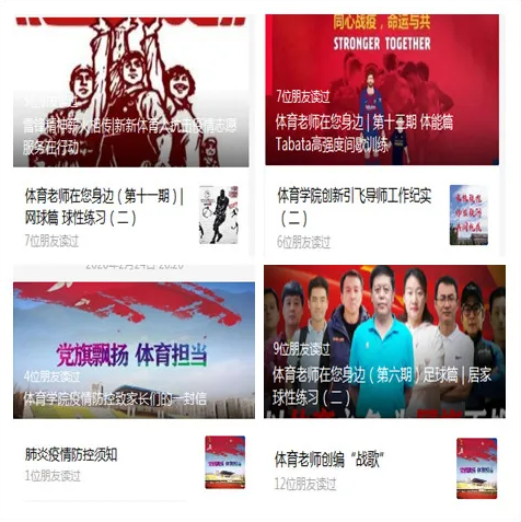 与教师党支部联合制作居家健身指导栏目《体育老师在您身边》、《党旗飘扬,体育担当》、《创新引飞导师工作纪实》等的微信推送,为参与体育战疫歌曲《萤光》创作。国难时,积极为国家和人民贡献一份力量。