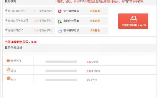2.后面的“学分”是要求完成的最低学分,每个“学分”可以折合5个学时。完成要求的最低学分“2+1.5+0.5=4学分”,相当20学时。在此基础上,还需在“视频学习”、“活动”、“作业”中任选“1学分”完成,超过5学分即25个学时,方可打印证书。