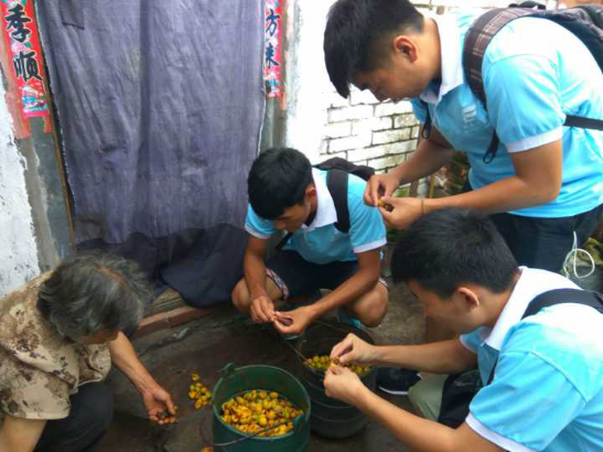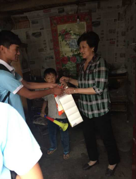 7月1日是我们活动的第一天,也是我们活动重头戏开展的一天。吃过早饭,我们乘车到达辉县,先去了当地的沙窑小学,虽然因为时间的不允许没有进行义务教学,但校长的热情接待让我们深深感动。从小学出来后我们又去了几家老人的家里,给老人带了一些生活用品。询问了老人家里的生活情况,老人的孩子都外出打工,其中一家一位老人独自带着两个小孩,生活艰辛。还有一位老人的老伴,尽管腿受伤,为了生活也带伤外出打工。看了这些老人的生活环境我也很难过,为我们的社会实践带来了很大感触。之后的几天,我们又去看望了几位老人,心中也变得更加沉重,这些老人的生活十分艰辛,我感到我们身上的担子也很沉重。7月5号实践结束,我们乘车回学校,临走时,一些老人出来相送,我们挥手道别。
