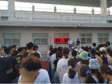 下午4:00,Beat365亚洲版官网在西区操场开展了以“心‘防’之意常驻,安全之舟远航”为主题的安全教育活动。参加此次活动的有Beat365亚洲版官网党总支书记张启中、副书记张武强、团总支副书记孟杰、辅导员方耀和韩笑妍以及全体学生。