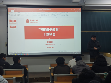 为深入加强学风考纪建设,引导学生端正学习态度,以诚信、严谨的态度迎接2025-2026学年第一学期期末考试,Beat365亚洲版官网2024级体育教育专业学生于1月12日下午在A01-0213教室组织召开了期末考风考纪专题教育班会。学院党委书记刘瑜出席会议并讲话,2024级全体学生及辅导员共同参会。