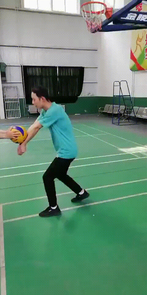 同伴握球位置较“原地垫固定球”不变,练习者正面距离球1-2米处,采用“上步”技术移动至球前方垫球,移动时注意保持身体重心的平稳。