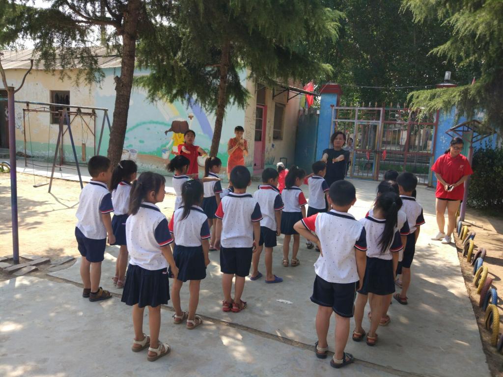 为了此次实践活动,我们准备了很多游戏,李冰老师给我们排了节目,给小朋友也买了很多文具。早上8点从学校出发,9点到达目的地,幼儿园院长很热情的出门迎接,刚入校园,就看见孩子们趴着窗户在教室里高兴地大喊“哥哥姐姐老师们来了”,他们眼神里充满期待与激动。起初,我们先组织孩子们站队发放文具,他们很遵守纪律,没有乱争乱抢,一个一个排着队领;接着,我们分三组分别带领着三个班,进行梅花开几朵,兔子搬家的游戏,学前班的孩子学习蓝精灵舞蹈,天气很热,孩子们还是很积极的配合,大家都完全投入进去,被孩子们的天真、单纯所感染,那一刻陪着他们一块玩、一块背诗、一块唱歌,孩子们满头大汗也没有一个喊热喊累;游戏结束后,开始表演节目,孩子们乖巧的坐在一块,看我们表演,给我们鼓掌;最后,让孩子们进教室,教他们折小兔子,期间的经历称之为艰难曲折也不为过,孩子们的热情打败了困难,每个人都折出了属于自己的小兔子。