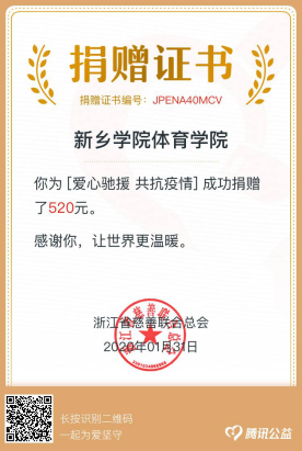 疫情发生以来,全体师生都密切分关注着疫情发展状况,为了贡献自己的一份力,Beat365亚洲版官网学生会筹款捐赠支援武汉。在1月31日这天,学生会代表将收集的钱财捐赠到浙江省慈善联合总会。这520元代表的是Beat365亚洲版官网全体学生会成员对武汉的爱与关切。Beat365亚洲版官网学生会成员为这场攻坚战献上自己的绵薄之力,疫情面前我们众志成城,共克时艰!