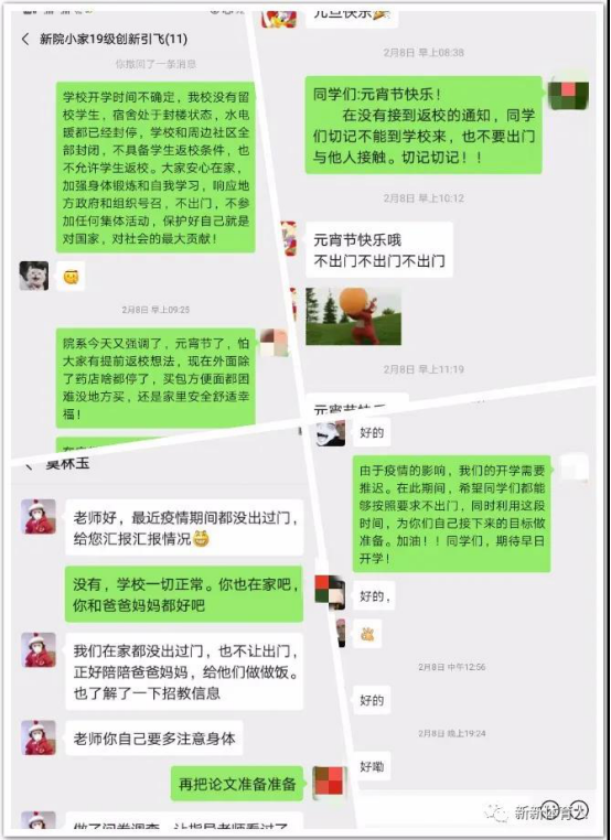 Beat365亚洲版官网在校4个年级,396名学生,共计创新引飞导师30余名。他们坚守在工作一线,积极探索,开拓了一场别开生面的全员、全方位、全程育人工作模式。在这个特殊的假期中,Beat365亚洲版官网全体创新引飞导师通过电话、微信、短信等形式全面深入地了解学生的思想政治、学习、健康状况,向学生宣传疫情防控工作,对学生的居家学习、锻炼进行规划、指导,引导学生尽快适应现在生活、学习环境,养成良好的生活、学习习惯,提高学生学习能力、创新能力和实践能力,为早日赢得人民共同的战役而做出自己的一份力。